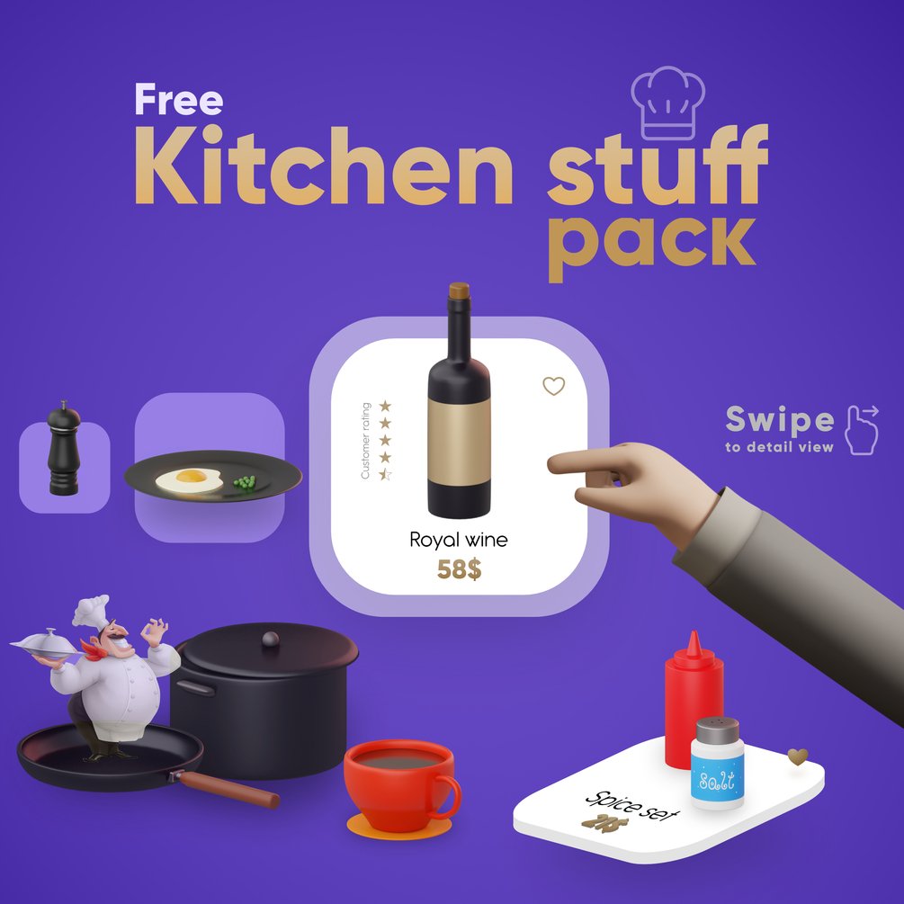 Kitchen icon packFruto21 ratingsA pack of some different kitchen stuff$0+0usdStandartGet all the png files with transparent background plus figma file$1+1usdExtendedGet all the images plus files for 3d software$2+2usdProGet all the files including .blend file30usdName a fair price:$Add to cartAdd to wishlist New wishlistShareShare on XShare on Facebook Copy linkCopy product URLRatings5(21 ratings)2155 stars100%4 stars0%3 stars0%2 stars0%1 star0%